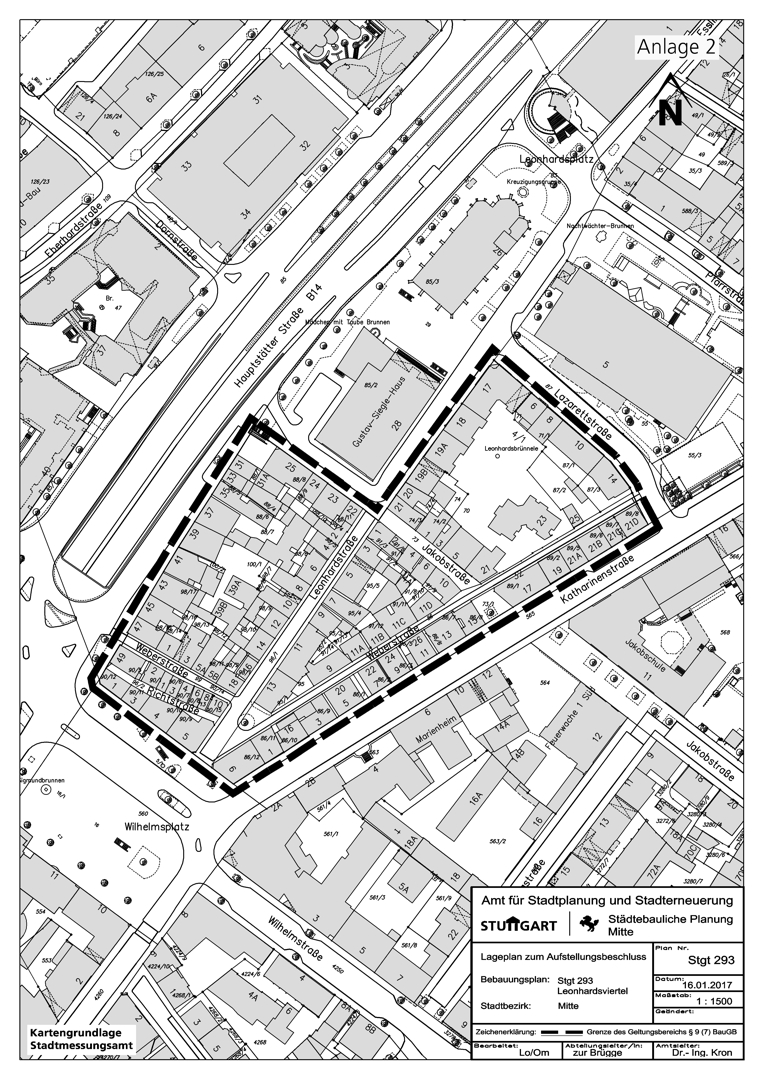 Der Lageplan zum Aufstellungsbeschluss zeigt das von der gestrichelten Linie umgebene Gebiet des Leonhardsviertels. Grafik: Stadtmessungsamt/Stadt Stuttgart