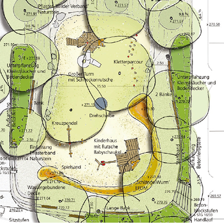 Ein großer Turm mit vielen Klettermöglichkeiten und Kurvenrutsche für die größeren Kinder, ein Spielhaus mit kleiner Rutsche und eine Babyschaukel für die Kleinen, dazu eine Gemeinschaftsschaukel und die beliebte Drehscheibe aus dem Bestand bilden das Angebot auf der Hauptspielfläche. Im Norden der Gesamtanlage ist sie als große Sandfläche mit den notwendigen Fallschutzbelägen naturnah angelegt.