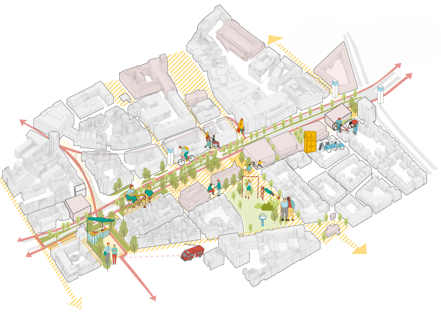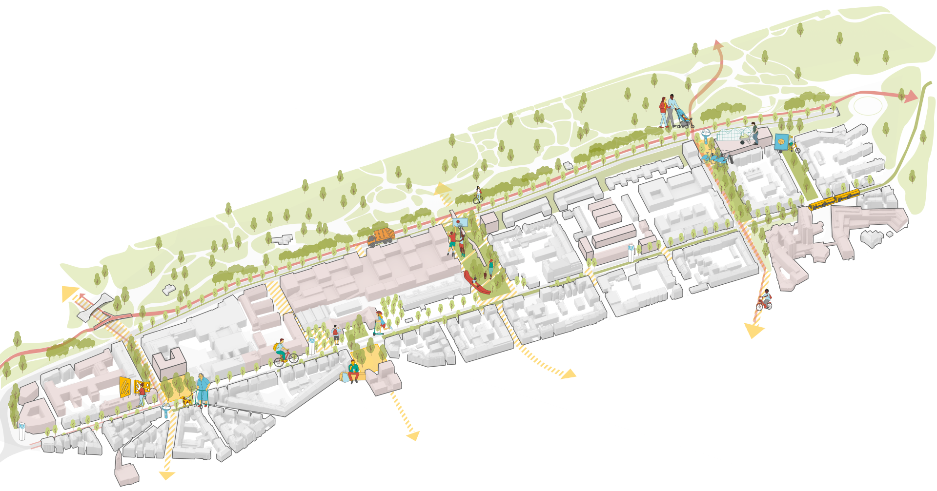 Dieser Abschnitt wandelt sich zu einer echten Klimaschneise und einem lebendigen Zentrum: