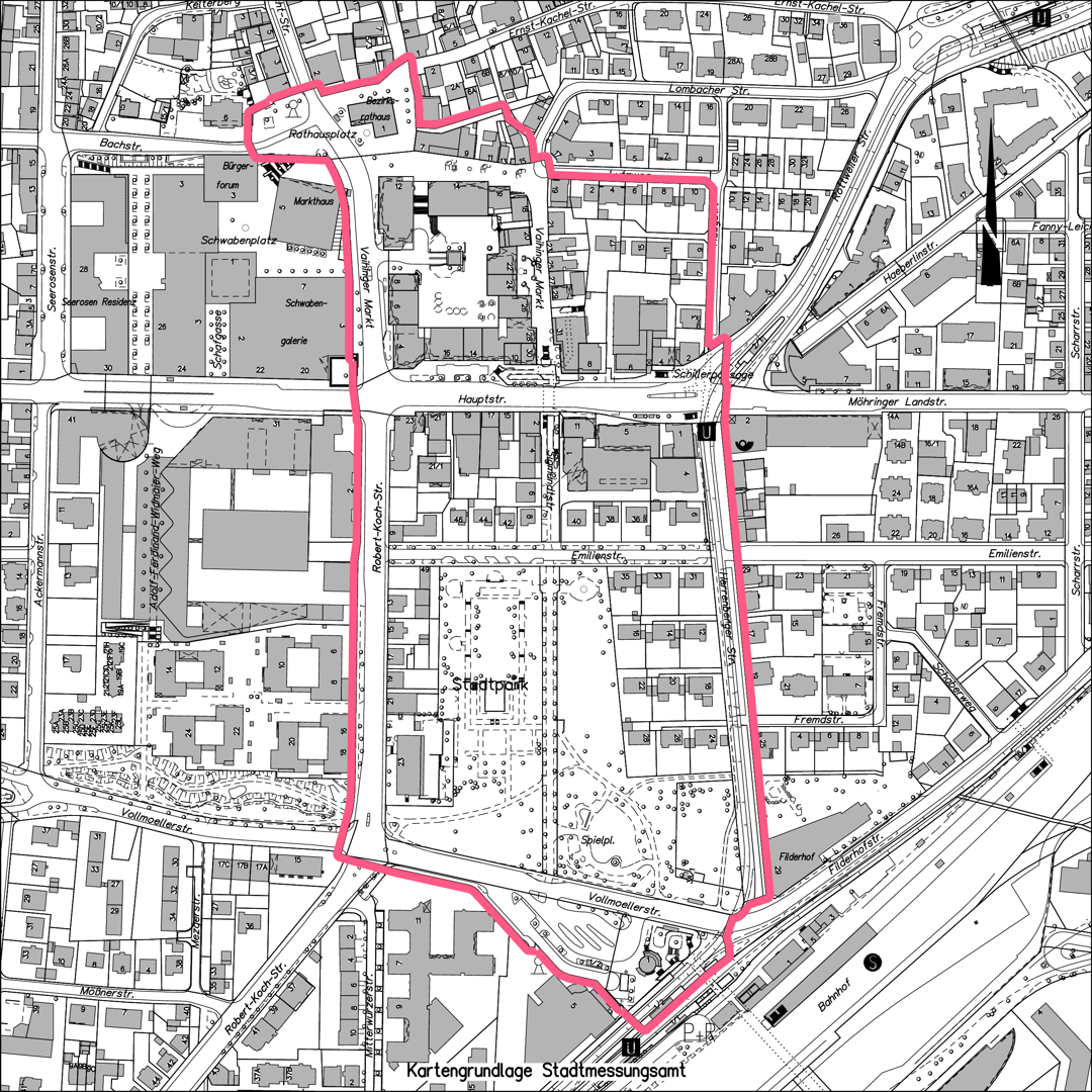 Diese Stadtbereiche bilden die Schwerpunkte des Untersuchungsgebiets, das im Norden vom Rathaus bis im Süden zum Bahnhof reicht. Das Untersuchungsgebiet wird nördlich der Hauptstraße nach Westen durch die Schwabengalerie, nach Norden mit dem Rathausumfeld und durch den Lutzweg und nach Osten durch die Haugstraße begrenzt. Die beiden Quartiere sind durch eine starke Nutzungsmischung geprägt, die sich auf der Südseite der Hauptstraße fortsetzt. Entlang der Emilienstraße und am Rand des Stadtparks ist überwiegend Wohnnutzung vorhanden. Dieser Untersuchungsbereich wird nach Westen durch die Robert-Koch-Straße begrenzt, die selbst nicht mehr im Untersuchungsgebiet liegt. Nach Osten bildet die Herrenberger Straße die Untersuchungsgebietsgrenze, die neben dem Weg durch den Stadtpark eine wichtige Verbindung zwischen Bahnhof und Stadtmitte über den Schillerplatz darstellt. Nach Süden bilden die Vollmoellerstraße sowie das Bahnhofsumfeld mit Busbahnhof den Rand des Untersuchungsgebiets.