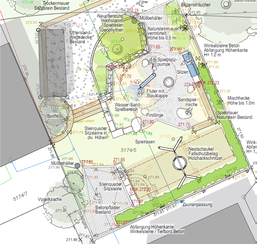 Weil die Fläche recht klein ist, werden verschiedene Spielpunkte vorgeschlagen. Ein Bodentrampolin, das sich die Kinder bei der Beteiligung sehr gewünscht haben, ist vorgesehen. Der vorhandene Baumbestand bleibt erhalten, die Grünflächen werden im Unterwuchs aufgewertet.
