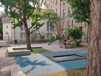 In diesem Wohnquartier wohnen zahlreiche Familien. Gärten oder Balkone haben die meisten Gebäude nicht. Im öffentlichen Raum gibt es nur einen kleinen Spielplatz und eine Freifläche. Beide Angebote sind sehr veraltet und werden zudem von manchen Nutzern zweckentfremdet. Um der Bevölkerung die Anwohnerstraße noch mehr als nutzbare Freifläche zur Verfügung zu stellen, soll dieser Raum umfassender gestaltet werden: das Parken kann auf eine Straßenseite beschränkt werden, auf der anderen Seite können Bäume gesetzt werden. Anwohnerinnen und Anwohner könnten Patenschaften für die Baumscheiben übernehmen und dort Blumen pflanzen. Sitzgelegenheiten, die die Nachbarn "besetzen", könnten aufgestellt werden.