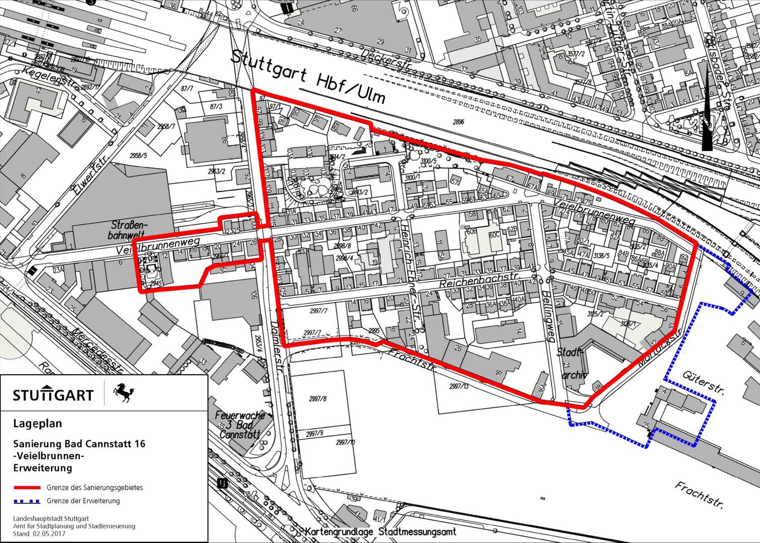 Im Sanierungsgebiet in seiner bisherigen Abgrenzung konnte ein Großteil der Maßnahmen zur Erreichung der Sanierungsziele umgesetzt werden. Im Zuge der aktuellen Planungen und Entwicklungen im Bereich des NeckarParks besteht zusätzlicher Handlungsbedarf, der die Erweiterung des bestehenden Sanierungsgebiets notwendig macht. Im Stadtbezirk Bad Cannstatt wird das bestehende Sanierungsgebiet Bad Cannstatt 16 -Veielbrunnen- um den Bereich des Zollamts und den Platz am Stadtarchiv, den Marga-von-Etzdorf-Platz erweitert.