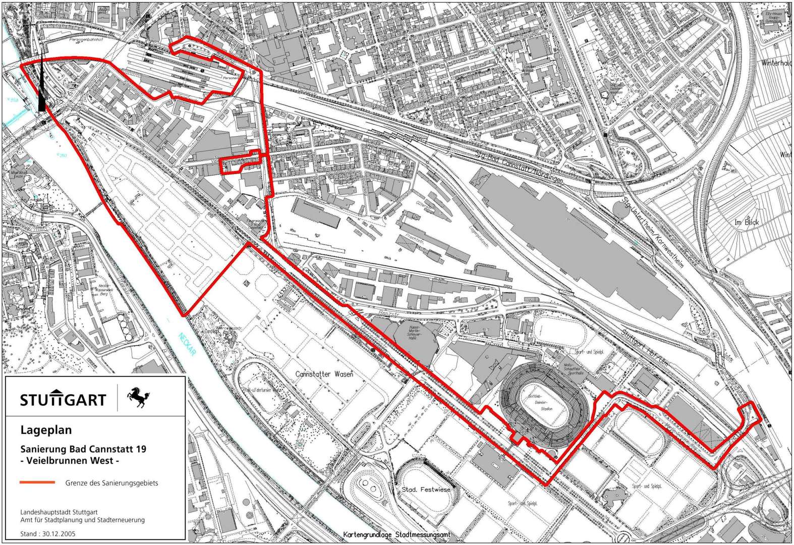 Das Sanierunsgebiet Bad Cannstatt 19 - Veielbrunnen West, das durch seine Lage zwischen Bahndamm und Neckarufer, seine Verkehrsgunst und die Nähe zu zentralen Sport- und Freizeiteinrichtungen gekennzeichnet ist, soll insgesamt einer standortgerechten Entwicklung zugeführt werden.