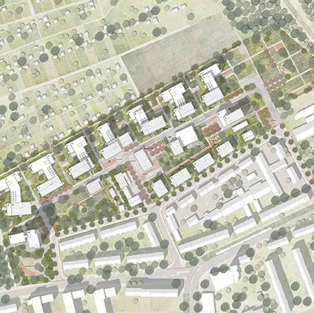 Die geplanten Neubauten werden zwischen drei und fünf Geschosse umfassen und sind eingebettet in eine umfangreiche Durchwegung, die den Anschluss des Neubaugebiets sowohl an die Bestandsquartiere als auch an das angrenzende Gartengebiet erlauben. Eine dem Siegerentwurf zugrundeliegende Idee ist es daher auch, die vorhandene Identität des Ortes nicht zu zerstören, sondern einzubinden, indem vorhanden Strukturen wie kleine Häuschen, ein Café oder Gärten im Baugebiet erhalten bleiben.