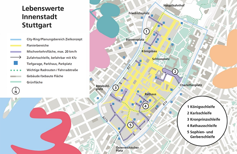 Gemäß dem vorgestellten Zeitplan soll bis zum Jahr 2035 der Innenstadtbereich für den KFZ-Verkehr in bestimmten so genannten Schleifen schrittweise umgestaltet werden.