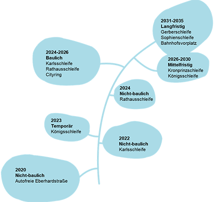 Anschließend (2026-2030) folgen Umbaumaßnahmen der Kronprinzschleife, die Rathausschleife und die Königsschleife. Zum Abschluss des Gesamtprojekts gehören neben dem Bereichen Bahnhofsvorplatz/Schillerstraße und der Sophienstraße auch die Gerberschleife (2031-2035). In diesem Bereich gibt es im Gegensatz zur restlichen Innenstadt einen höheren Anteil an Wohnnutzungen. Daher will die Stadt mit den Anwohnenden vor den Umgestaltungen in Dialog treten und Beteiligungsformate durchführen. Das sind die zusammengefassten Umsetzungsstufen: