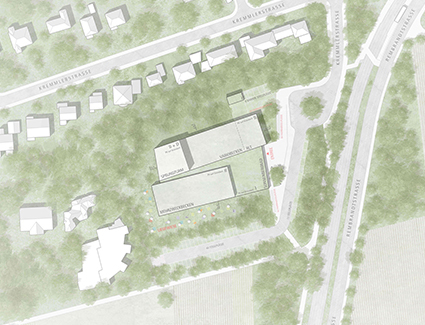 Der Siegerentwurf besteht aus zwei riegelförmigen Baukörpern und einem gemeinsamen Eingangsbereich.