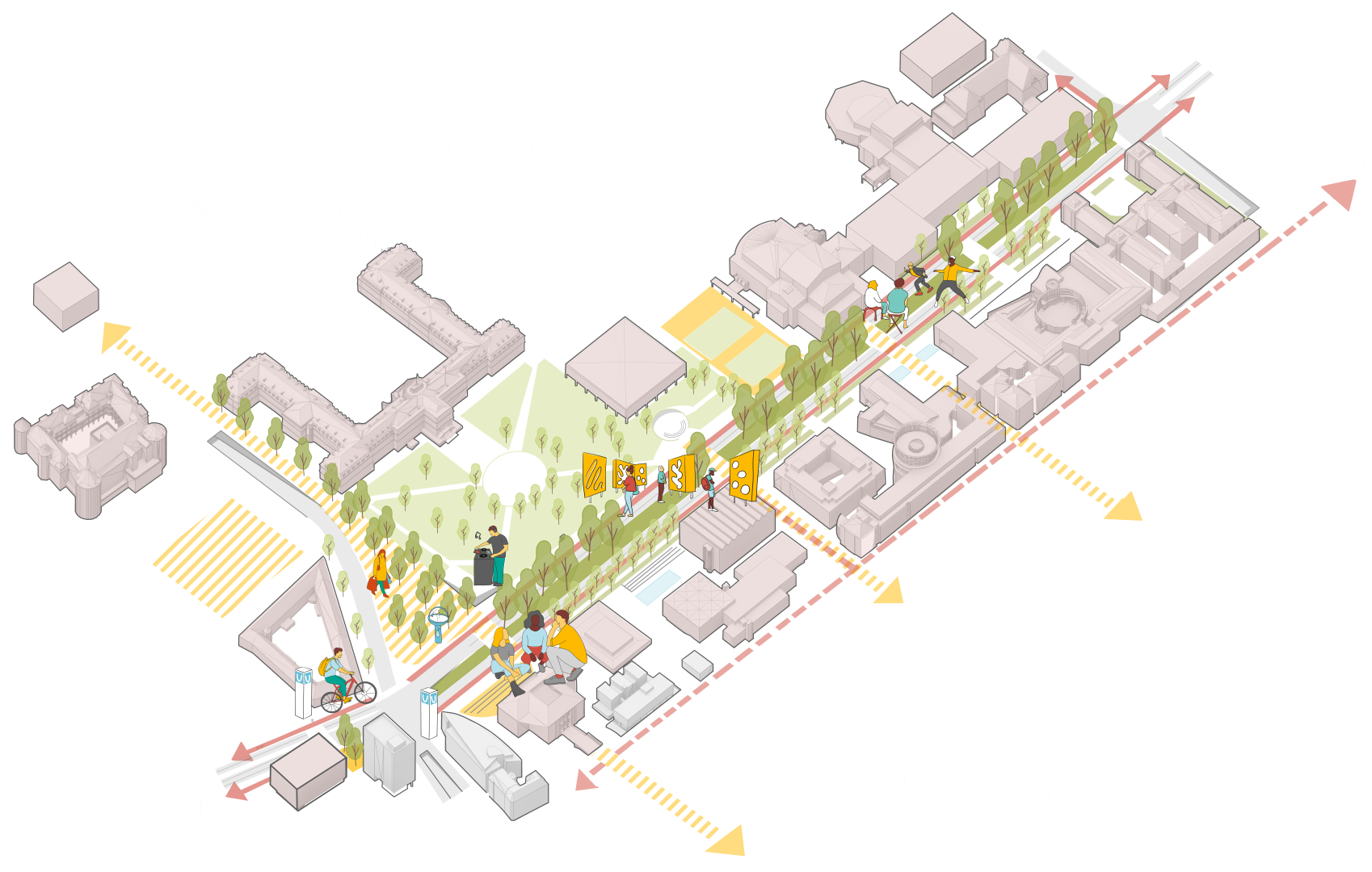Dieser Abschnitt wandelt sich zu einer echten Klimaschneise und einem lebendigen Zentrum: