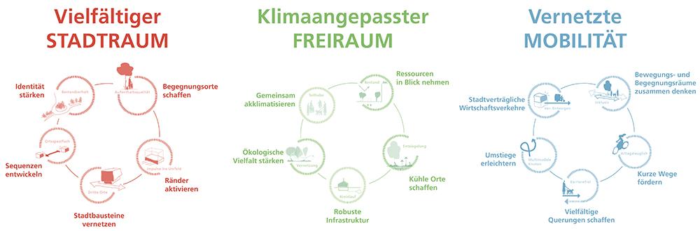 Verschiedene Fortbewegungsmöglichkeiten werden gefördert: zu Fuß, per Rad, per Auto oder per Bus. Es entstehen außerdem neue Grün- und Freizeitflächen, um die Aufenthaltsqualität zu erhöhen, Begegnungsorte auszubauen. Ziel ist es, den öffentlichen Raum für die Menschen attraktiver zu gestalten. - Es entsteht ein vielfältiger Stadtraum.