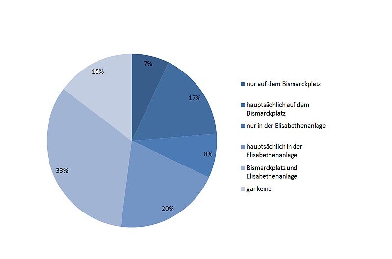Spielflächen am Bismarckplatz sind insbesondere für Familien mit Kindern und Jugendlichen ein wichtiges Thema. Dennoch hat sich die größte Gruppe mit 27 % für eine Spielfläche hauptsächlich in der Elisabethenanlage ausgesprochen. 23 % möchten eine Spielfläche auf dem Bismarckplatz und in der Elisabethenanlage.