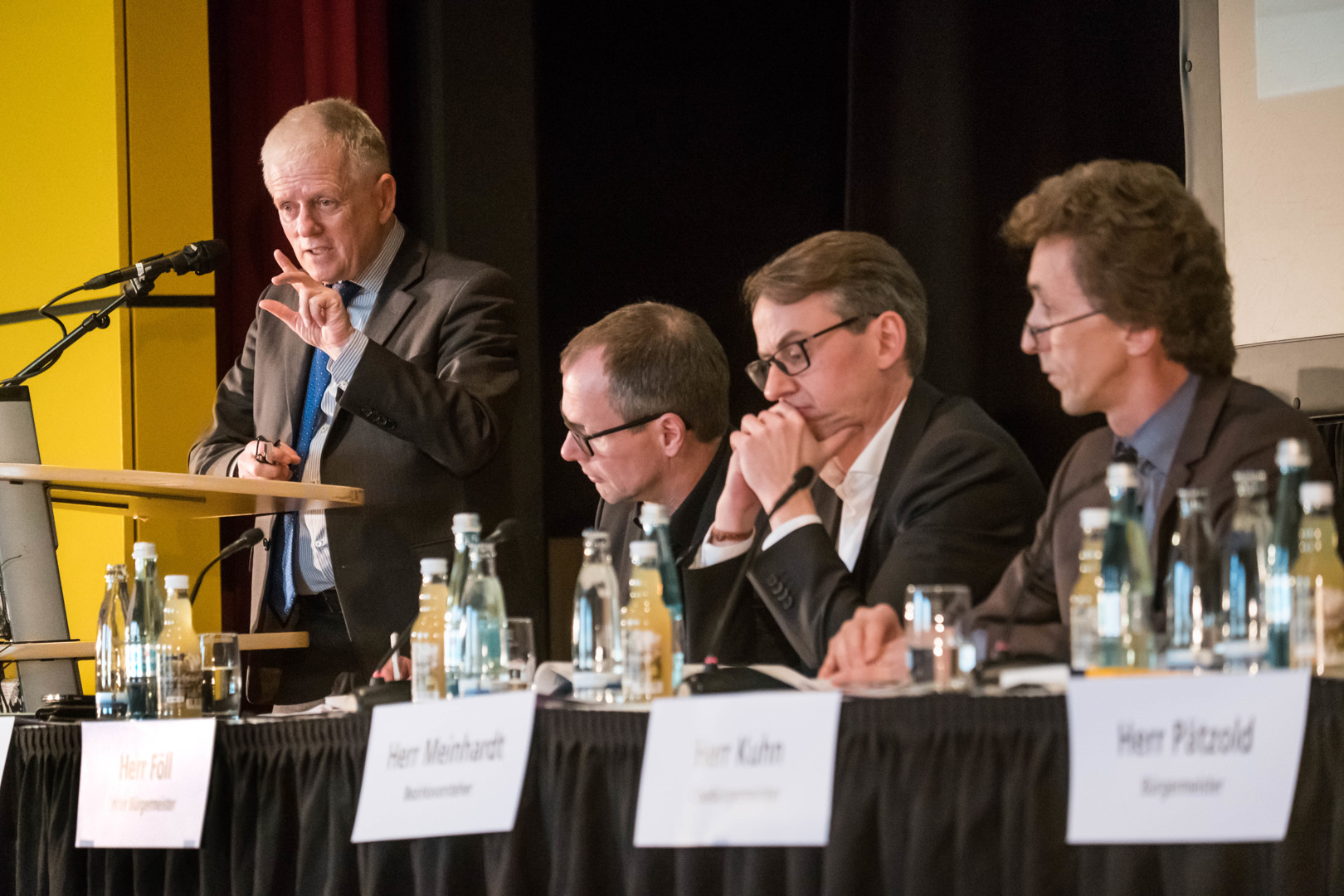Die Vaihinger nutzten die Versammlung und trugen (v.l.) dem OB, den Bürgermeistern - im Bild Dirk Thürnau und Michael Föll - sowie Bezirksvorsteher Wolfgang Meinhardt ihre Anliegen vor. Foto: Lichtgut/Achim Zweygarth