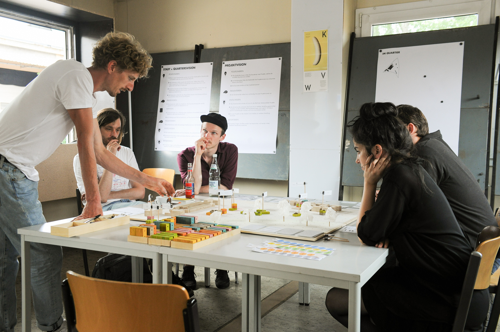 Matthias Printschler stapelt mit bunten Holzbausteinen zwei Mauern. Sie stehen sich gegenüber, zwischen ihnen ist nur das leere Spielfeld zu sehen. "Die Bausteine stellen Gebäude dar, die für temporäres Wohnen vorgesehen sind, beispielsweise für Obdachlose", erklärt er. "Die Fläche dazwischen wird vom Niemandsland zum Jedermannsland. Hier treffen verschiedene Gesellschaftsschichten auf einander, durchmischen sich und inspirieren sich gegenseitig." Printschler ist einer von vier Spielteilnehmern, die sich am Samstag, 23. Juli, auf dem Areal des Kunstvereins Wagenhalle in die Bürgerbeteiligung Rosenstein einbringen und am Offenen Format "Stadtbühne" teilnehmen."Bei der Stadtbühne geht es um kollaborative Wissensproduktion", erklärt Aaron Schirrmann von der Initiative TAUT - Temporary Artists Utopia Tool, der das Spielkonzept zusammen mit Aida Nejad als Studienarbeit entwickelt hat. "Verschiedene Akteure der Stadtgesellschaft erarbeiten gemeinsam Ideen für das neue Rosensteinquartier und die Einbindung der Wagenhallen in die neu entstehende Nachbarschaft." Die Ideen werden dann auf verschiedenen Spielfeldern verortet. Das Spiel beginnt mit der Vorstellung der Teilnehmer. Die Spielführer Schirrmann und Nejad verteilen Akteurskarten, die die Rollen im Spiel definieren. In dieser Runde verkörpert Matthias Printschler von der Staatlichen Akademie der Bildenden Künste Stuttgart einen Forscher, Martin Langlinderer von der offene Werkstatt Hobbyhimmel einen Unternehmer, Daniela Vitali von Contain't einen Verein und Musiker Reinhold Buhr eine Einzelperson. Im folgenden Spiel setzen sich die Spieler in Kleingruppen mit den Interessen und Bedürfnissen der anderen Akteure auseinander und erarbeiten gemeinsam Visionen und Projektideen für die Entwicklungsfläche Rosenstein.