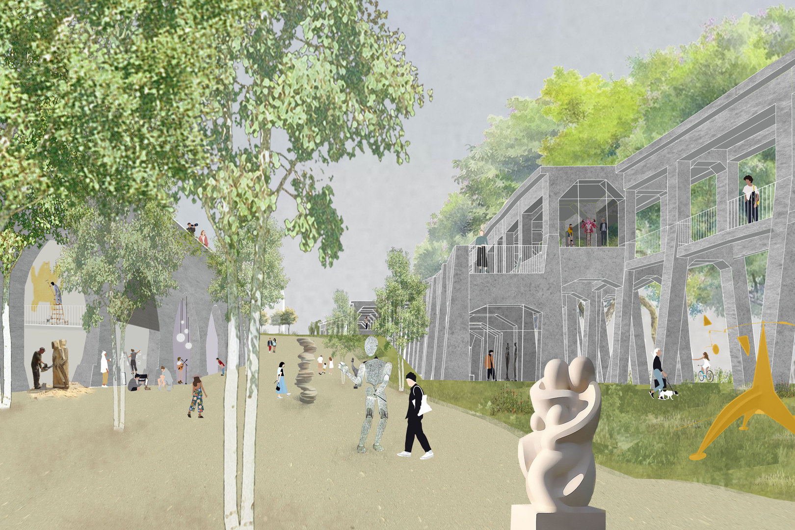 Alte Bahnbauwerke wie das Überwerfungsbauwerk sollen im neuen Quartier erhalten bleiben und einer neuen öffentlichen Nutzung zugeführt werden. Grafik: asp Architekten GmbH