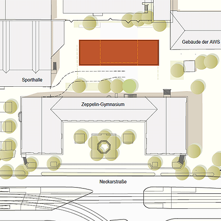 Hinter dem bestehenden neoklassizistischen Schulgebäude des Zeppelin-Gymnasiums entsteht auf dem Schulhof ein dreigeschossiger Neubau. Das Gebäude befindet sich auf der derzeit als Bolzplatz genutzten asphaltierten Fläche zwischen Hauptgebäude, Sporthalle und der benachbarten Abfallwirtschaft Stuttgart.